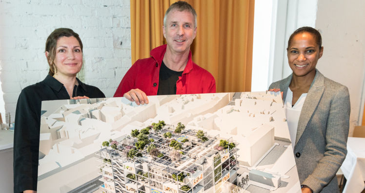 Das Gebäude selbst erinnert an ein Regal - es basiert auf einem sogenannten "Grid", einem Rahmen. Dieser schafft, so Jakob Dunkl, Raum an der Fassade, ist flexibel, macht das Haus lebendig und auch das Dach gut nutzbar, u. a. für eine Photovoltaikanlage und für die Beschattung. Alle sogenannten dienenden Elemente des Gebäudes (Technik, Aufzüge, Treppen) befinden sich im Grid. Dies sorge für Nutzungsfreiheit im Inneren. "Extensions", die mit ihren Glasflächen die Außenseite der Fassade begrenzen, sorgen für Besonderheit, Flexibilität, Sichtbarkeit und Transparenz, beschreibt der Architekt. In der durch den Grid entstandenen luftigen Arkade werden ein paar Geschäfte angesiedelt.