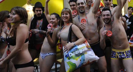 Unter diesem Motto hat das spanische Modeunternehmen in seine Filiale in Lyon geladen. Die südostfranzösische Stadt war eine der vielen Stationen der Werbeaktion "Seminaked", mit der Desigual weltweit auf Tour ist. Im Rahmen der Aktionen können sich 100 (Halb-)nackte, die als erste die jeweilige Desigual-Filiale stürmen, zwei Gratis-Kleidungsstücke aussuchen.