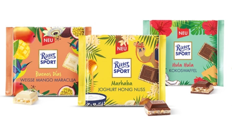 Fernweh im Quadrat, so könnte man die neuen Produktsorten von Ritter Sport bezeichnen. Die neue "Fernweh Edition" des deutschen Schokoherstellers hat sich von Traumzielen in der ganzen Welt inspirieren lassen und drei neue Sorten kreiert: die Sorte "Buenos Días" schmeckt nach weißer Mango und Maracuja und steht für Costa Rica, "Hula Hula" erinnert mit ihrem Geschmack nach Kokoswaffel an Hawaii, die Sorte "Marhaba" soll mit dem Geschmack nach "Joghurt, Honig und Nuss" nach Marokko entführen.