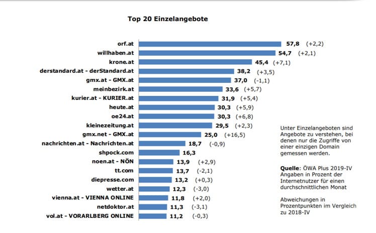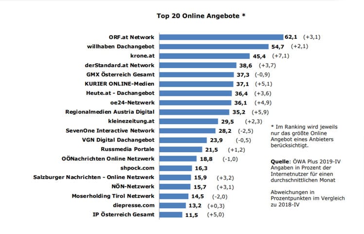 Wo im Print die Krone unangefochten am Thron sitzt (hier finden Sie die Zahlen und Fakten zur aktuellen Media-Analyse), da ist am Digitalmarkt der ORF alteingesessener "King of the Castle". Sei es in Zeiten turbulenter Polit-Entwicklungen oder im Angesicht einer globalen Pandemie, der öffentlich-rechtliche Sender bewährt sich bei der Leserschaft in seinem digitalen Auftritt als rasche und zuverlässige Quelle: mit einer Reichweite von 62 Prozent oder 4.091.786 Unique Usern pro Monat liegt das ORF-Network bei den Dachangeboten weiter an der Spitze. Aber auch das willhaben-Dachangebot kann es sich mit 3.606.627 Unique Usern und 54,7 Prozent Reichweite weiterhin auf Platz Zwei gemütlich machen. Auch auf Platz Drei gibt es keine Veränderung zu vermelden: hier residiert der Print-Reichweitenkaiser mit seinem Online-Auftritt krone.at und 2.989.470 Unique Usern bzw. 45,4 Prozent weiterhin auf einem gefestigten Platz Drei.