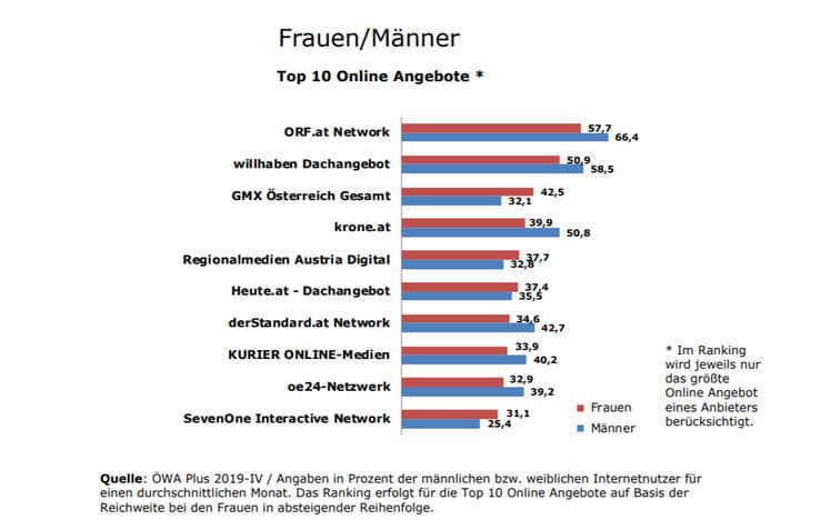 Der Blick auf die mobile und geschlechterspezifische Nutzung gestaltet sich bei der aktuellen ÖWA am interessantesten: bei ersterer gibt es vor allem bei Einzelangeboten am meisten Bewegung zu vermelden: mit willhaben.at (36,8 Prozent Reichweite) klettert ein nicht-journalistisches Angebot auf den ersten Platz, krone.at kann mit 30 Prozent ORF.at ausstechen, der mit 29,9 Prozent in diesem spezifischen Rennen knapp klein Bei geben muss. Unter den Vermarktern liegt Goldbach Audience mit 4.028.144 Unique Usern pro Monat (61,1 Prozent) erneut an erster Stelle – vor Russmedia-Vermarkter austria.com/plus (2.713.098 Unique User, 41,2 Prozent) und Red Bull Media House Netzwerk (731.429 Unique User, 11,1 Prozent). Dabei muss austria.com/plus als einziger Vermarkter im Jahresabstand ein Minus von 4,5 Prozentpunkten hinnehmen.