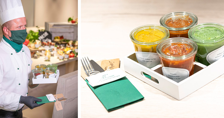 Die Speisen werden hygienisch und steril just-in-time von Köchen mit Handschuhen, Haube und Mundschutz abgefüllt und kommen somit garantiert kontaktlos bis zum Gast, versprechen Stubenberg und Benedict. Aufgrund der vorkonfektionierten Verabreichungsart sei auch die Verweildauer des Gastes am Buffet deutlich reduziert, was nicht erwünschte Schlangen am Buffet verhindern soll.