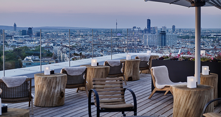 Auf der großzügigen Dachterrasse im 16. Stockwerk des Hotels „Andaz Vienna Am Belvedere“ können Gäste nicht nur mit einem Drink in der Hand die einzigartige Aussicht über Wien genießen, sondern werden auch kulinarisch verwöhnt!