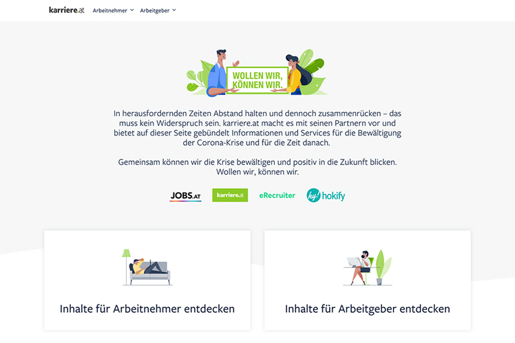 Auf wollenwirkoennenwir.at als erster Anlaufstelle fürs Karriere- und Berufsleben finden Arbeitnehmer und Arbeitgeber umfangreichen kostenlosen Content für die Bewältigung von Corona und die Zeit danach. Die Themenpalette reicht von Home Office und virtueller Führung über Remote Recruiting und Arbeitsrecht bis zur digitalen Candidate Journey und positivem Denken. Das Karriereportal und seine Partner transportieren die Inhalte, die kontinuierlich erweitert werden, über unterschiedlichste Kanäle wie Webinare, Blog, Podcast oder E-Book.