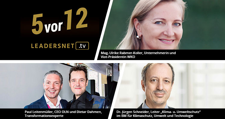 Die Unternehmerin und Chefin der Rabmer Gruppe und Vize-Präsidentin der Wirtschaftskammer Österreich, Ulrike Rabmer-Koller, sowie der Leiter der Abteilung "Klima und Umweltschutz" im Bundesministerium für Umwelt, Klimaschutz und Technologie, Jürgen Schneider, waren heute zu Gast im LEADERSNET-Live-Talk "5 VOR 12". Gemeinsam mit Paul Leitenmüller und dem Transformationsexperten Dietmar Dahmen diskutierten sie die Frage, ob Nachhaltigkeit und Klimaschutz auch nach der Krise wichtige Wirtschaftsmotoren sein können.