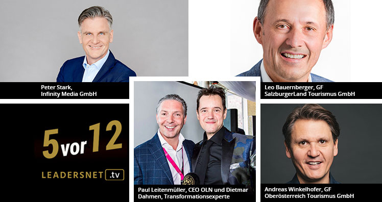 In der 42. Folge diskutierten im LEADERSNET-Live-Talk "5 VOR 12" Andreas Winkelhofer, Geschäftsführer Oberösterreich Tourismus GmbH, Leo Bauernberger, Geschäftsführer SalzburgerLand Tourismus GmbH, sowie Peter Stark, Geschäftsführer Infinity Media, bei Gastgeber Paul Leitenmüller und Co-Moderator Dietmar Dahmen über die Öffnung der Regionen nach der Krise, motivierte Beherbergungs- und Gastronomiebetriebe und neue Vertriebswege, um die Österreicherinnen und Österreicher in die schönsten Regionen des eigenen Landes zu "locken".