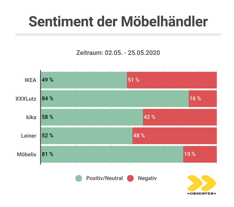 Wirft man einen Blick auf die Marktstimmung, so fällt auf, dass sich besonders XXXLutz über positive Reaktionen freuen darf. Mit einem positiven/neutralen Anteil von 83,9 Prozent und einem geringen negativen von 16,1 Prozent lässt man sogar Marktführer Ikea (positiv/neutral: 48,6 Prozent; negativ: 51,4 Prozent) deutlich hinter sich.