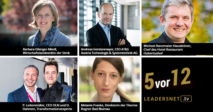 In der 49. Folge diskutierten im LEADERSNET-Live-Talk "5 VOR 12" die steirische Wirtschaftslandesrätin Barbara Eibinger-Miedl, AT&S Austrian Technologie & Systemtechnik AG-CEO Andreas Gerstenmayer, Therme Rogner Bad Blumau-Direktorin Melanie Franke sowie Michael Ranzmaier-Hausleitner, Tourismusobmann von Spielberg und Chef des Hotel Restaurant "Hubertushof", über die Stärke der steirischen Wirtschaft, die kreativen Möglichkeiten der touristischen Kommunikation und die große Möglichkeit durch die Formel 1-Rennen, die steirische Region und die dort beheimateten Betriebe medial und auch international bestmöglich zu präsentieren.