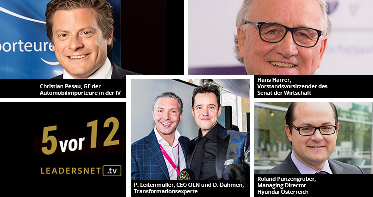 In der 50. Folge diskutierten im LEADERSNET-Live-Talk "5 VOR 12" Hans Harrer, Vorstandsvorsitzender des Senat der Wirtschaft Österreich, Christian Pesau, Geschäftsführer des Verbandes der Automobilimporteure in der Industriellenvereinigung, und Roland Punzengruber, Managing Director von Hyundai Österreich, über nachhaltige Innovationen in der Automobil-Branche, die neue Art des Autokaufs und neue Formen der Mobilität.