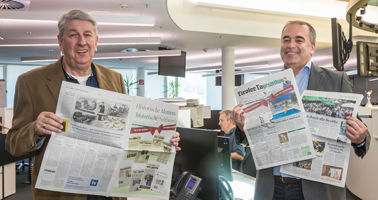 Die Tiroler Tageszeitung feiert ihren 75. Geburtstag. "Wir stehen seit 75 Jahren für qualitätsvolle Information, höchste Servicequalität und Innovation. Auf diese Stärken werden wir auch in Zukunft sowohl im Print- als auch im Digitalbereich bauen. Unser besonderer Dank gilt heute allen TT- Mitarbeitern, die gemeinsam mit vollem Einsatz die Marke Tiroler Tageszeitung zur Nummer 1 in Tirol machen", so die Moser Holding-Vorstände Hermann Petz und Silvia Lieb.