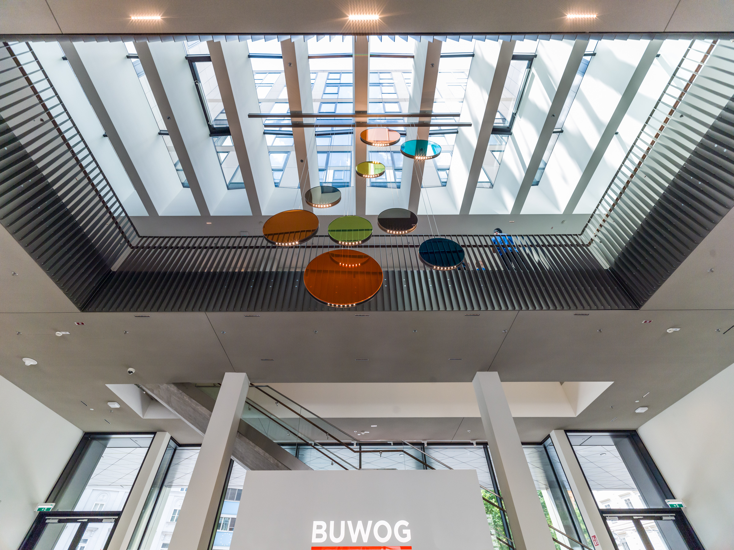 Bereits beim Rückbau des Vorgängergebäudes wurden sämtliche wiederverwertbaren Bauteile gezielt einer neuen Funktion zugeführt. Der Neubau wiederum wurde mit höchstem Augenmerk auf nachhaltige Baumaterialien errichtet. Die hocheffiziente Kühlanlage, die Photovoltaik-Anlage, die Doppelfassade, die einerseits die Lüftungsanlage unterstützt und als thermischer Puffer wirkt, sowie das umweltschonende Mobilitätsangebot von E- Ladestationen bis zu einem Leihräder-System machen das BUWOG Kunden- und Verwaltungszentrum zu einem zukunftsweisenden nachhaltigen Standort im Herzen der Stadt.