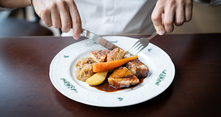 Auf der ausgewählten Speisekarte darf auch der Eugen21 Signature Dish nicht fehlen: Der wohl beste Schweinsbraten der Stadt wird urtypisch aber mit innovativem Twist serviert.
