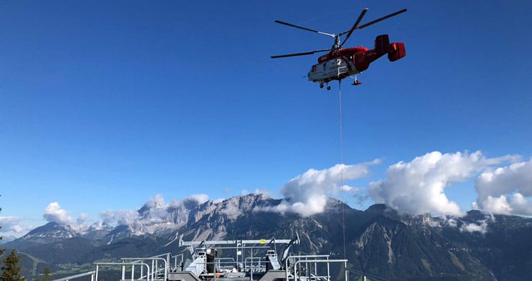Nach einer Sicherheitsunterweisung startete der russische Schwerlasthubschrauber "Kamov-KA" vom Flugunternehmen Heli Swiss bei schönstem Wetter um 8:00 Uhr beim Abflugplatz Weitmoos Tal. Mitarbeiter der Planai-Bahnen haben gemeinsam mit Facharbeitern der Spezialfirma Klaunzer aus Osttirol die einzelnen Stützenteile für den Transport vorbereitet und sich an der jeweiligen Stelle in Position gebracht.