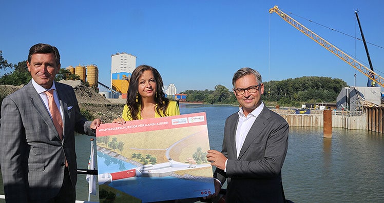 Am Alberner Hafen wird in den kommenden Monaten gebaut. Am Mittwoch präsentierten Wirtschaftsstadtrat Peter Hanke, Umweltstadträtin Ulli Sima und Umweltstaatssekretär Magnus Brunner das neue Hochwasserschutz-Projekt im Wiener Hafen Albern. Am Plan stehen die Ertüchtigung der Dämme, das Schlagen von Spundwänden und schließlich die Legung der Fundamente für das neue, massive Hafentor in Albern. Letzteres wird riese Ausmaße aufweisen: 250 Tonnen soll das neue Hafentor auf die Waage bringen und rund 30 Meter lang, 14 Meter hoch und 2,1 Meter dick sein.