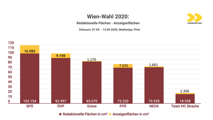 Am 11. Oktober geht die Wien Wahl 2020 über die Bühne. Der Wahlkampf nimmt langsam an Fahrt auf und die Parteien fahren ihre Werbepräsenz hoch. Die Media Intelligence-Agentur Observer hat die Printanzeigen-Aktivitäten der einzelnen Parteien zwischen 7. und 13. September unter die Lupe genommen – und wird das bis zum Wahltermin wöchentlich machen.