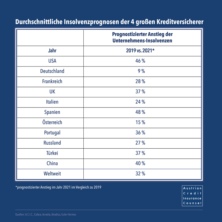 Laut den Berechnungen von Androsch anhand der Daten der vier großen Kreditversicherer wird die Zahl der Unternehmenspleiten im Jahr 2021 in Österreich im Vergleich zu 2019 um 15 Prozent steigen. Bei Österreichs laut Außenhandelsstatistik Österreich zweitwichtigster Export-Nation, den USA, wird ein Plus von 46 Prozent erwartet, in Italien 24 Prozent und in Frankreich 28 Prozent.