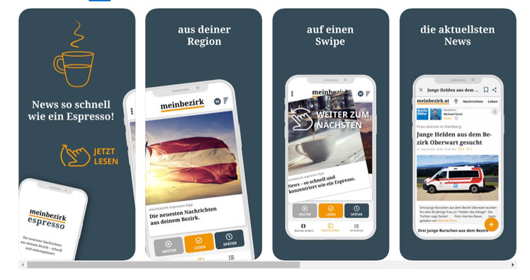 Regionale Nachrichten auf einen Swipe: Das verspricht die neue meinbezirk espresso-App der Regionalmedien Austria (RMA). Wie die RMA in einer Aussendung mitteilt, soll den Leserinnen und Lesern so eine "völlig neue, einzigartige Möglichkeit, Nachrichten aus allen Bezirken Österreichs zu konsumieren", geboten werden.