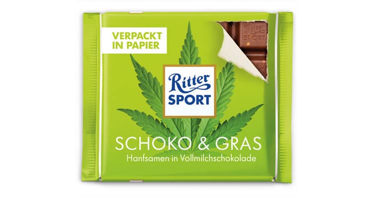 Nachhaltigkeit ist "in" – genauso wie Gras: Passend zu diesen zwei Trends hat Ritter Sport eine Sorte herausgebracht, die Beides vereint: Die Ritter Sport "Schoko & Gras" verpackt in Papier "bietet ab sofort für alle Schokoholics einen ganz legalen Schoko-Trip", wirbt der deutsche Schokoladespezialist für die Limited Edition, die erstmals in einer nachhaltigen Papierverpackung in die Verkaufsregale kommt.