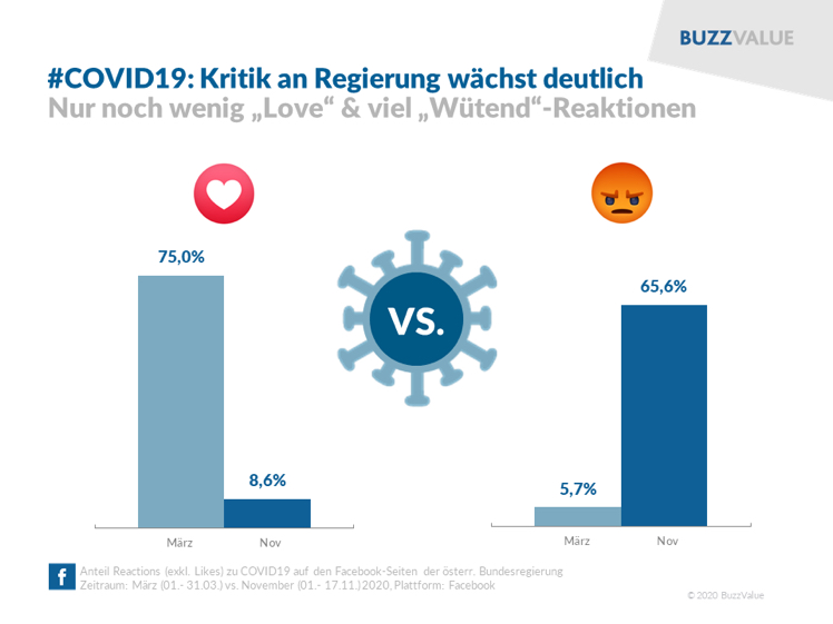So haben sich die Anteile der Facebook-Reaktionen seit dem ersten Lockdown im März deutlich verschoben. Mit 65,6 Prozent "Wütend"- und nur 8,6 Prozent "Love"-Reaktionen auf die COVID-19-Posts der Ministerinnen und Minister ist die Kritik der User gegenüber der Regierung im November deutlich spürbar. So war im Vergleich das Meinungs- und Stimmungsbild im März mit 75 Prozent "Love"- und nur 5,7 Prozent "Wütend"-Reaktionen auf die Facebook-Beiträge der Bundesregierung noch deutlich positiver.