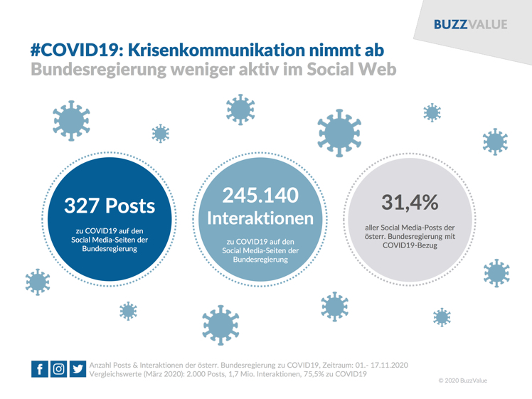 Die sozialen Medien sind für die österreichische Bundesregierung einer der Schlüsselkanäle in der aktiven Krisenkommunikation. Der Widerstand der Bevölkerung zu aktuellen Maßnahmen nimmt auch im Social Web mehr und mehr zu. Auch deshalb ist die Regierung in ihrer aktiven Krisenkommunikation auf Facebook und Co deutlich zurückhaltender als noch im Frühjahr. Das geht aus einer Analyse der Social Media-Marktforscher von BuzzValue hervor.