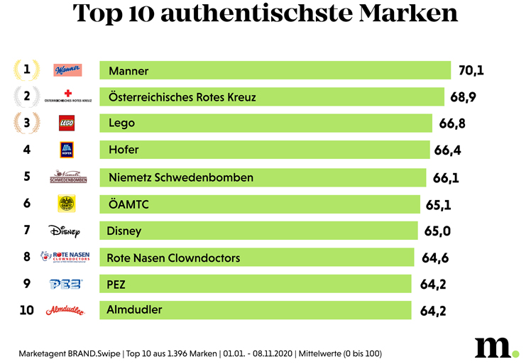 Nur knapp hinter Manner folgt das Österreichische Rote Kreuz auf Rang 2. Mit dem ÖAMTC und den Rote Nasen Clowndoctors schaffen es insgesamt drei gemeinnützige bzw. Non-Profit-Organisationen auf die Bestenliste der authentischsten Marken. Der letzte Stockerlplatz hat zwar keine österreichischen Wurzeln, blickt jedoch auf eine lange Tradition zurück: Seit Jahrzehnten bereichert der dänische Spielzeugklassiker Lego so manches Spielzimmer und ist dabei aus Sicht der Befragten stets authentisch geblieben. Ähnlich verhält es sich mit der Marke Disney, die seit 1923 bis heute Kindheitserinnerungen hervorruft und damit in Hinblick auf die Authentizität auf Rang 7 landet. Zuletzt schafft es der Drogeriemarkt dm knapp unter die Top 20 der authentischsten Marken.