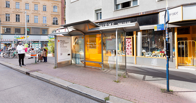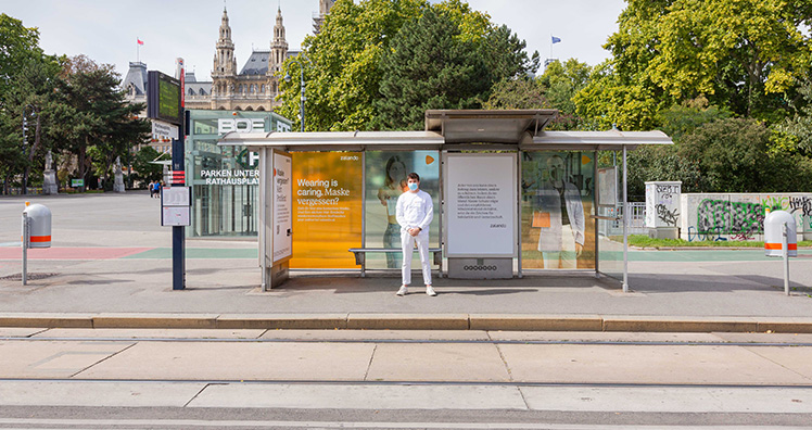 Solta: Ich möchte die Kampagnen erwähnen, die auch mit Corona konnotiert sind. An sechs hochfrequentierten Standorten in Wien setzt die Gewista für Zalando via Wartehäuschen-Sonderwerbeformen eine kreative Sensibilisierungskampage zum Thema MNS-Schutz unter dem Motto "Na Oida! Maske vergessen? Wearing is caring." um. Gerade direkt vor dem Einsteigen in öffentliche Verkehrsmittel wird daran erinnert einen MNS zu tragen. Für alle die ihren vergessen haben, schafft Zalando hier Abhilfe. Das im Total-Look in Kombination mit City Lights- gebrandete Wartehäuschen ist ein optischer Hingucker und die darin befindlichen City Lights fungieren als MNS-Dispenser. Auf dem City Light-Sujet reicht ein weibliches Testimonial symbolisch einen MNS der auch haptisch einfach zu bekommen ist. Die Passanten gelangen über das Scannen eines QR Codes am Sujet, mittels Smartphone oder Tablet, direkt auf eine eigene Zalando Landing Page. Durch betätigen des dort aufscheinenden Zalando-Buttons wird am City Light über einen Dispenser in Echtzeit einzeln verpackte MNS ausgegeben.