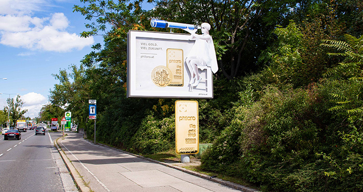 Solta: Ja, es gab eine tolle Kampagne auf Rolling Boards mit Sonder-Installationen. Philoro setzte im Zuge seiner aktuellen Imagekampagne auch auf einen breit angelegten Out of Home-Mediamix. Neben analogen und digitalen City Lights, Transportmedia und Rolling Boards, kamen auch kreative Sonderwerbeformen an Rolling Boards zum Einsatz, welche den Unternehmensauftritt eindrucksvoll unterstreichen. "Die Zukunft ist Gold" konnten wir sehr aufmerksamkeitsstark im öffentlichen Raum umsetzen. Es ist sicher eine der Highlight-Kampagne des Jahres, mit einem maßgeblichen OOH-Anteil.