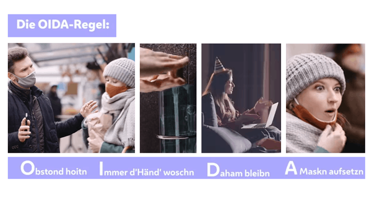 Das Ergebnis ist ein Erklärvideo, dass uns zeigt, was "OIDA" in Zeiten einer globalen Pandemie bedeutet: O für "Obstond hoitn", I für "Immer d'Händ woschn", D für "Daham bleiben" und A für "A Maskn aufsetzn". Na dann moch ma des doch alle, "OIDA"! (rb)