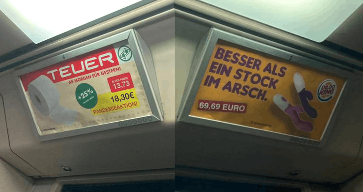 Im selben U6-Waggon fand sich noch ein skandalöseres Plakat: Auch hier erinnerte das Logo des "Werbetreibenden" stark an das einer bekannten Marke. Nur, dass statt der Fast Food Kette "Burger King" hier ein gewisser "Dildo King" Erwachsenenspielzeug um den anrüchigen Preis von 69,69 Euro anbot – und das unter dem Slogan: "Besser als ein Stock im Arsch."