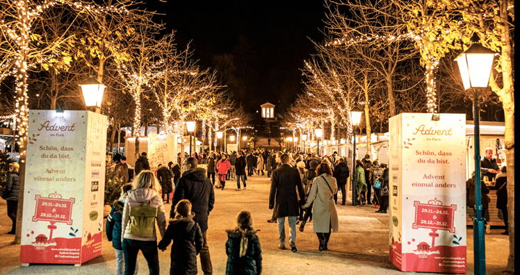 Da im weitläufigen Kurpark viel Platz für einen Spaziergang an der frischen Luft ist, möchte Advent im Park presented by Volksbank den Besucherinnen und Besuchern des Parks auch ohne die gewohnten Punsch- und Verkaufshütten weihnachtlichen Flair bieten. Nicolas Hold erzählt: "Wir möchten den Menschen gerade am Ende dieses anspruchsvollen Jahres eine Freude machen und Hoffnung schenken. Unsere treuen Adventmarkt-Gäste sind traurig, aber dennoch verständnisvoll gegenüber der Absage. Deshalb möchten wir zumindest für die Spaziergänger einige Punkte von Advent im Park unter sicheren Bedingungen umsetzen."