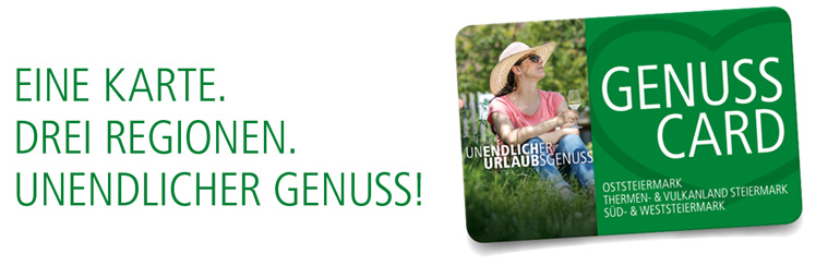 Die GenussCard ist die kostenlose Eintrittskarte zu einer unvergesslichen Entdeckungsreise durch das Thermen- und Vulkanland Steiermark, der Oststeiermark sowie der Süd- und Weststeiermark: Die Karte mit den meisten Inklusivleistungen Österreichs verbindet die besten Angebote aus drei Regionen und wird schon ab der ersten Nächtigung in einem der derzeit rund 170 GenussCard-Beherbergungsbetriebe an den Gast ausgegeben.