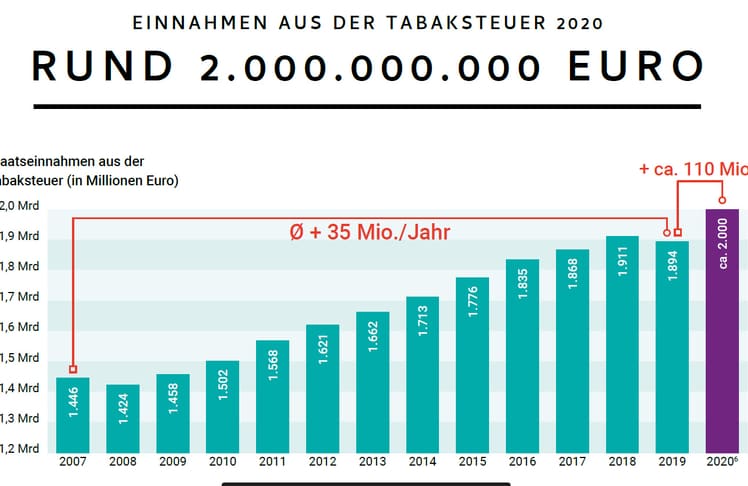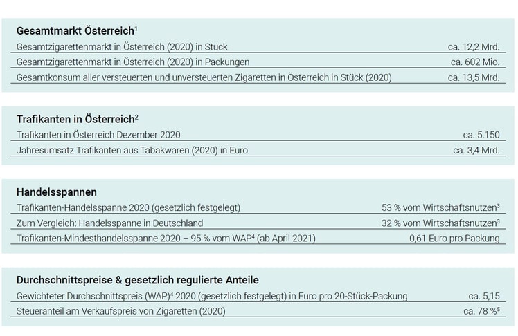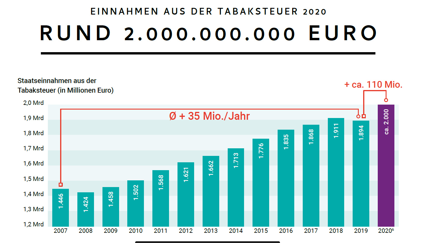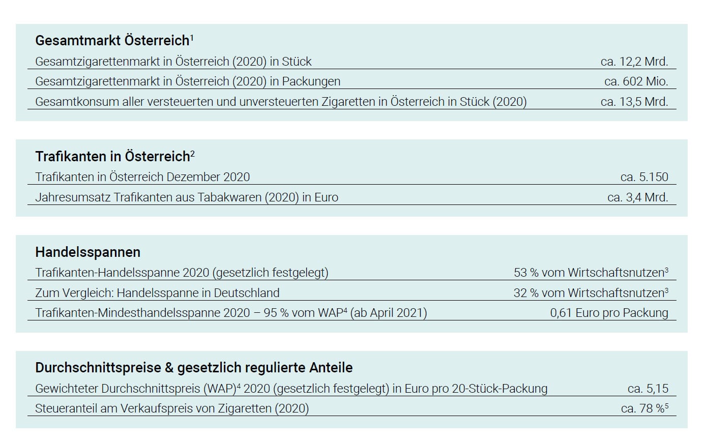 Der österreichische Tabakmarkt zeigt sich inmitten wirtschaftlicher Turbulenzen als stabiler Faktor. Darüber hinaus führte die einmalige Sondersituation der Reisebeschränkungen und geschlossenen Grenzen im Jahr 2020 zu zusätzlichen Umsatz- und Spannenzuwächsen für den Handel. Der Zigarettenabsatz in den 5.150 Trafiken erhöhte sich um rund 500 Millionen Stück auf 12,2 Milliarden. In Kombination mit einer Steuererhöhung brachte dies dem Fiskus ein signifikantes Plus bei den Tabaksteuereinnahmen. Inklusive Mehrwertsteuer hat der Staat 2020 2,6 Milliarden Euro über Zigaretten eingenommen.
