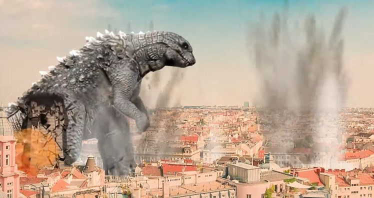 "Hätte da nicht irgendwo noch Godzilla reingeschnitten werden können?", fragt eine Betreiberin einer niederösterreichischen Tierschule scherzhaft im Netz. Kurz darauf machte sich "Team Turbo" ans Werk und lässt in einer Persiflage das legendäre Filmmonster quer durch die Innenstadt stapfen und alles zerstören. (jw)