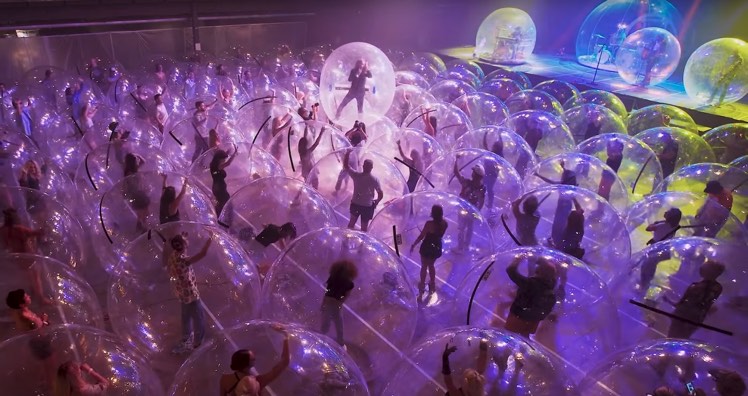 Alle Anwesenden des Konzerts mussten sich in so einem "Space Bubble" aufhalten, wobei maximal drei Zuschauer pro Ball erlaubt waren. Um einen ungehinderten Musikgenuss zu gewährleisten, waren die "Space Bubbles" mit Lautsprechern bestückt. Die weitere Ausstattung bestand aus kleinen Ventilatoren, um die Hitze erträglich zu machen, eine Flasche Wasser gegen den Durst, Handtücher, um sich den Schweiß abwischen zu können und die "Bubble" zu reinigen, sollte sie sich beschlagen sowie ein "Ich muss pinkeln/Es ist heiß hier drinnen"-Schild.