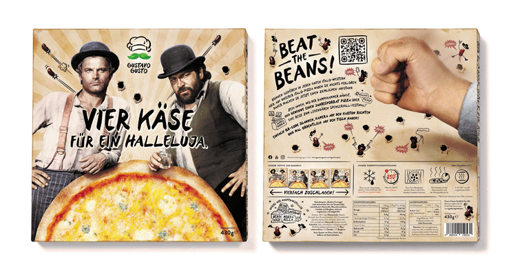 Gustavo Gusto bringt neue Tiefkühlpizza mit Bud Spencer und Terence Hill auf den österreichischen Markt: Die klassische "Quattro Formaggi"-Variante wird hier zu "Vier Käse für ein Halleluja" und wird mit vier unterschiedlichen Motiven auf der Packungsoberseite angeboten.