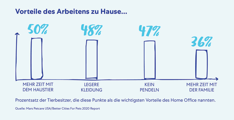Durch das verstärkte Arbeiten von zu Hause sind Haustiere nun noch mehr in das Leben ihrer Besitzer eingebunden. Auf die Frage nach den Vorteilen von Home Office gab die Hälfte der Befragten an, dass der größte Nutzen darin besteht, mehr seit mit ihren Haustieren verbringen zu können – der höchste Wert unter den abgefragten Vorteilen.