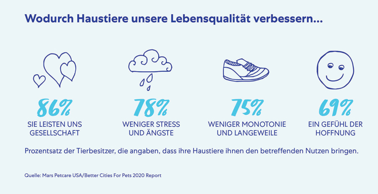 Folgende Unterstützung erhielten die Befragten von ihren Haustieren: 86 Prozent schätzen die Gesellschaft ihrer Haustiere, 78 Prozent leiden weniger unter Stress oder Angstgefühlen, 75 Prozent empfinden dank Haustier weniger Monotonie oder Langweile und für 69 Prozent bedeutet ihr Tier ein Gefühl der Hoffnung.