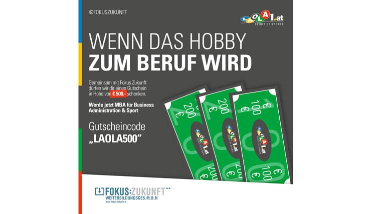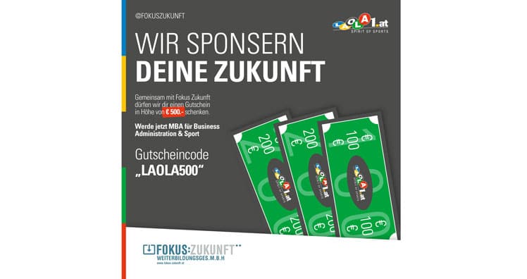 Als Medienpartner der Weiterbildungsgesellschaft "Fokus:Zukunft" forciert Laola1 sein Engagement für eine nachhaltige Förderung der österreichischen Sportbranche. Neueinsteiger im MBA-Studiengang "Business Administration & Sport" werden ab sofort mit einem Bildungsgutschein in Höhe von 500 Euro unterstützt. Dieser kann bei der Anmeldung mit der Nennung des Codeworts "LAOLA500" aktiviert werden.