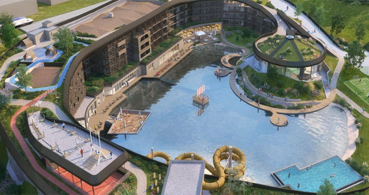 Die Superlative werden auch ebenerdig weitergehen: Das Herzstück des neuen Family Resorts bildet der erweiterte Natursee mit Sandstrand, die 2.800 Quadratmeter große Acquapura SPA & Wasserwelt und die mit 120 Meter Länge größte Indoor-Wasserrutsche Südtirols.
