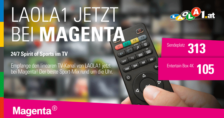 Bei Magenta ist Laola1 ab sofort auf allen Magenta-TV-Boxen und in der Magenta-TV-App zu empfangen. Auf der TV-HD-Box, dem TV-HD-Recorder und dem CI+ Modul ist der Sender auf Kanalplatz 313 zu finden, auf der Entertain Box 4K auf Platz 105.
