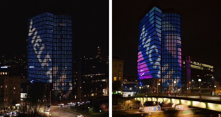 Die Werte-Bespielung des 21-stöckigen Gebäudes am Donaukanal vis-à-vis der Urania erfolgt ab Einbruch der Dunkelheit bis Mitternacht und wird regelmäßig zu sehen sein. Möglich machen das rund 160.000 einzelne LEDs, die in den Fensterachsen der 7.000 Quadratmeter großen Außenfassade montiert sind.