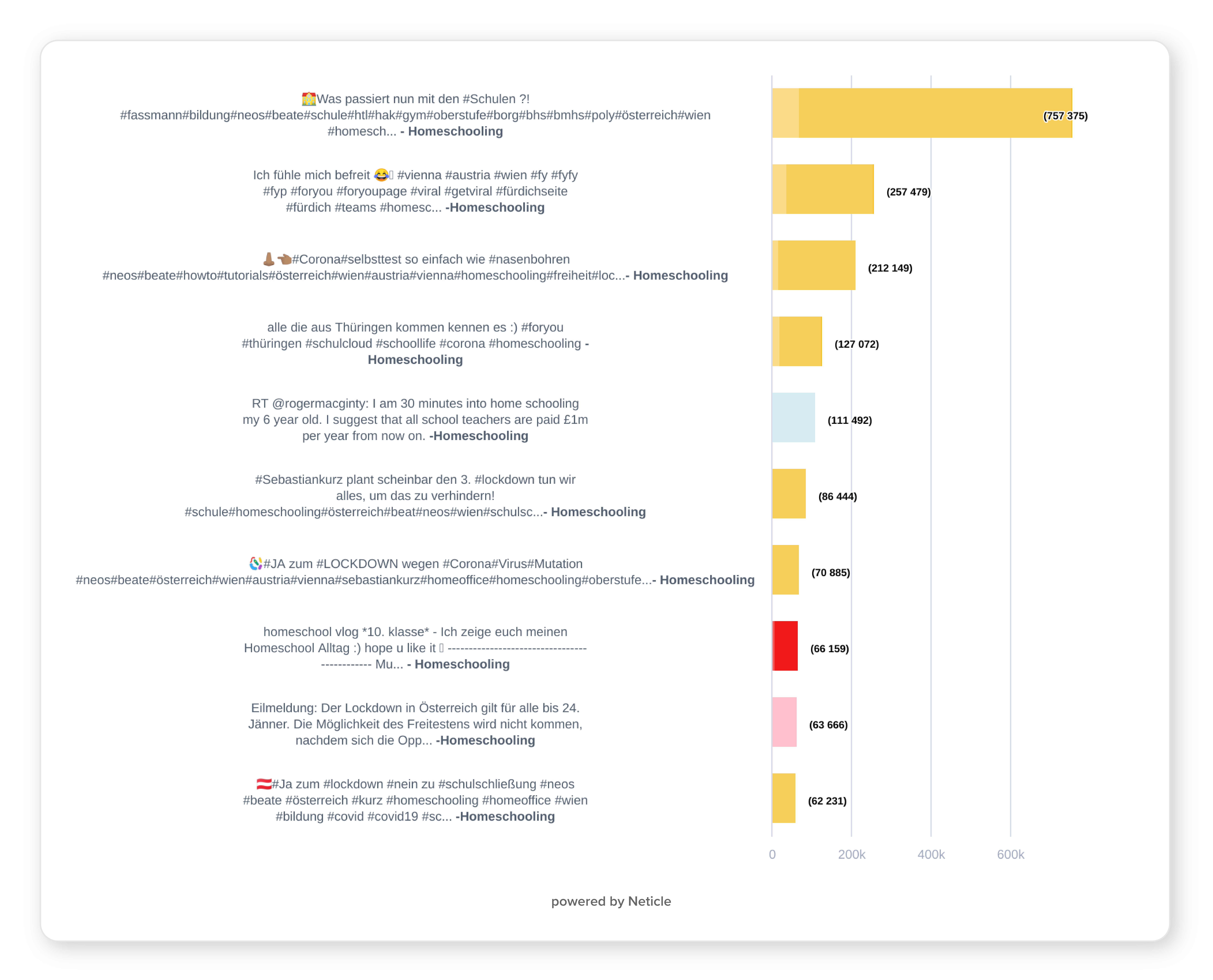 Die negativen Meinungen lassen sich auch an den Beiträgen verfolgen, die die meisten Interaktionen (Like/Reaktion, Kommentar, Share, Videoansehen) hervorriefen. Die Internetbenutzer hatten jedoch auch eine humorvolle Herangehensweise. Die meisten solcher Beiträge, die die größte Aktivität generierten, stammen vom TikTok (obwohl auf dieser Plattform die wenigsten Inhalte zum Thema Homeschooling erschienen). NEOS-Politikerin Beate Meinl-Reisinger wurde mit mehreren Beiträgen sehr populär, nicht nur wegen ihren Ansprachen zu strittigen Themen, sondern auch weil sie zeigte, wie man einen Schnelltest richtig durchführt. Im November und im Dezember warb sie gegen die Schließung der Schulen.