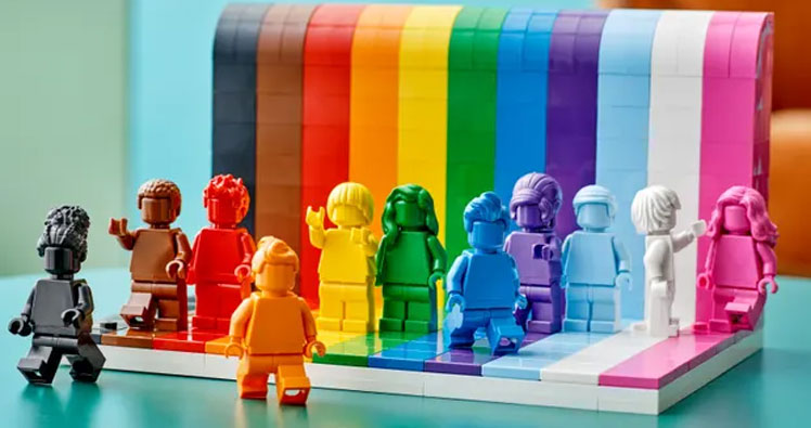 Was geschieht, wenn sich ein Designer im "Sprühraum" des Lego-Hauptquartier mit Farbe austobt? Heraus kommen winzige Figuren mit leuchtender, glänzender Farbe überzogen, die auf einem Regenbogen platziert sind. Das Set, das aussieht wie ein kunterbunter Wasserfall aus Farbe ist mit elf brandneuen Minifiguren das erste "LGBTQ+"-Set des dänischen Spielzeugherstellers mit dem Titel "Everyone is awesome", was zu Deutsch "Jeder ist fantastisch" bedeutet.