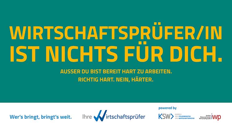 Bevor man erfolgreicher Wirtschaftsprüfer ist, steht dem interessierten Nachwuchs eine lange, aufwendige und schwierige Ausbildung bevor. Als Absolvent zählte man dafür dann zur Elite in der Wirtschaft, so die Idee der künstlichen Verknappung, die im Claim "Wer's bringt, bringt's weit" zum Ausdruck kommt.