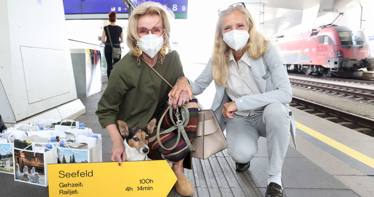 Vier Tage lang ging es um Kultur und Natur für rund 20 Künstlerinnern und Künstler im Astoria Seefeld in Tirol. Einige waren bereits vor Ort, andere reisten nach – und einige der Künstlerinnen und Künstler bestiegen vergangenen Donnerstag den Zug in Richtung Seefeld. Etwas mehr als vier Stunden dauert die Reise, auf der die Gäste von Elisabeth Gürtler begleitet wurden. Das Lunchpaket – Brot und Süßes, Sacher Cuvee und viel Mineralwasser – hat die Gastgeberin persönlich überreicht. Auch mit dabei: Elisabeth Gürtlers Hündin Ela, die die Vorzüge des hundefreundlichen Astoria sowie des Bahnfahrens bestens kennt und schätzt.