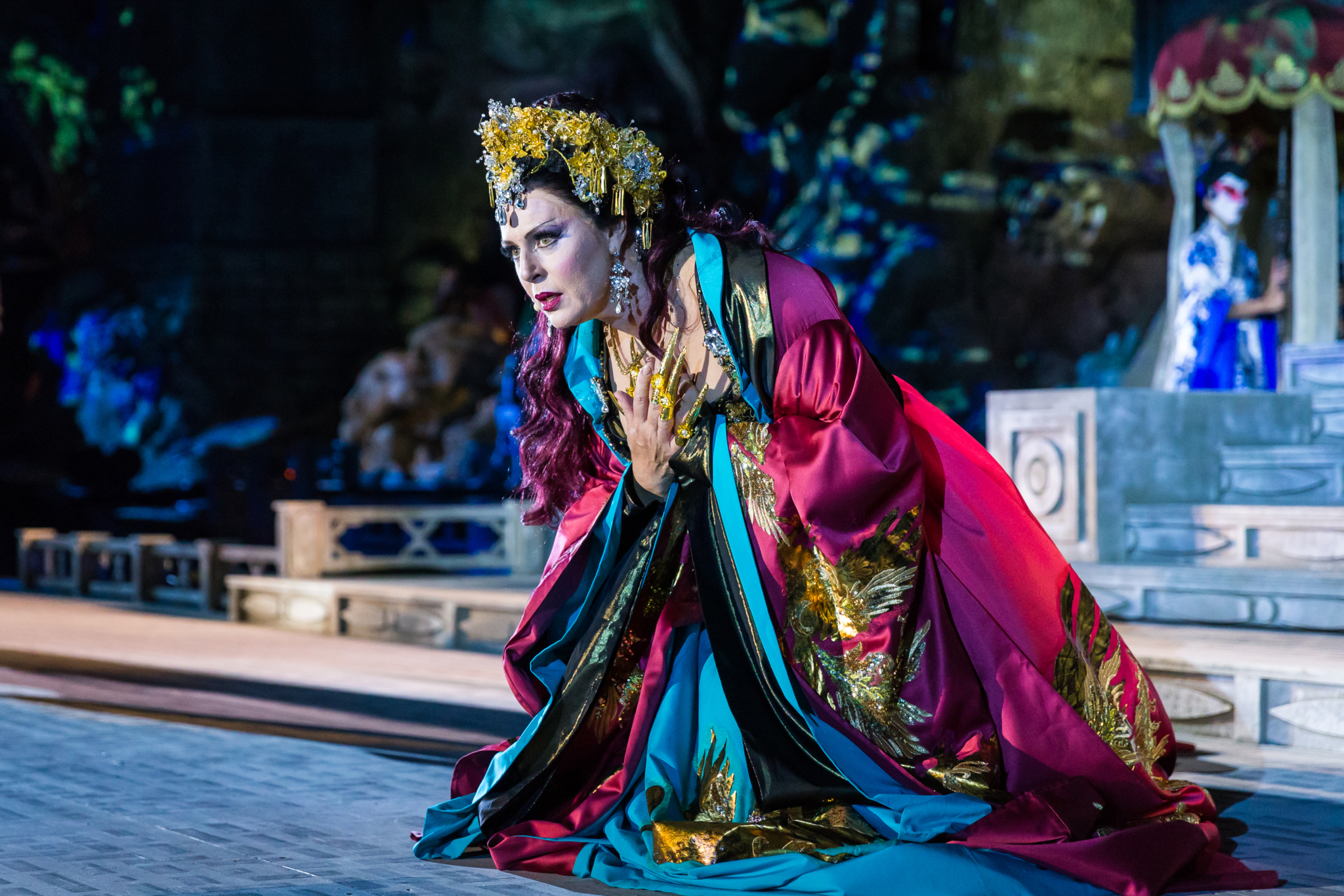 Besonders gestaunt hatte das Premieren-Publikum zudem über die opulente Ausstattung in rustikalem Rahmen des Römersteinbruchs. Der elfenbeinfarbene Palast der Prinzessin erstreckt sich über mehrere Stockwerke und wird je nach Stimmung in unterschiedliche Lichtwelten getaucht. Während sich Turandot im Spiel der Liebe von rotem Licht umgeben sieht, wurden bei bei Liùs Abschiedsarie ein dunkles Blau mit heftigem Regen und Blitzen inszeniert. Auch sonst dient das Bühnenbild als Projektionsfläche mit herumschwirrenden gelben Kugeln, chinesischen Schriftzeichen, güldenen Drachen oder einem farbenfrohem Puzzle, für das Bühnenbildner Paul Tate dePoo verantwortlich zeichnet.