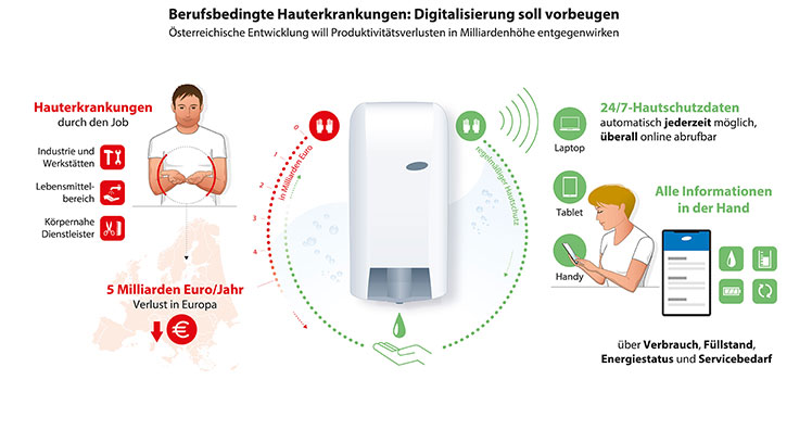 Mehr als fünf Milliarden Euro im Jahr entgehen Europas Volkswirtschaften laut einer dermatologischen Studie, und zwar durch Hauterkrankungen aus dem Job. Dabei ließe sich ein beträchtlicher Teil der Einbußen verhindern, so das Hygieneunternehmen Hagleitner. Eine Weltneuheit hat die Firma kürzlich vorgestellt: einen industriellen Hand- und Hautschutzspender, der als erstes Gerät seiner Art standardmäßig auch Anwendungsdaten sendet.