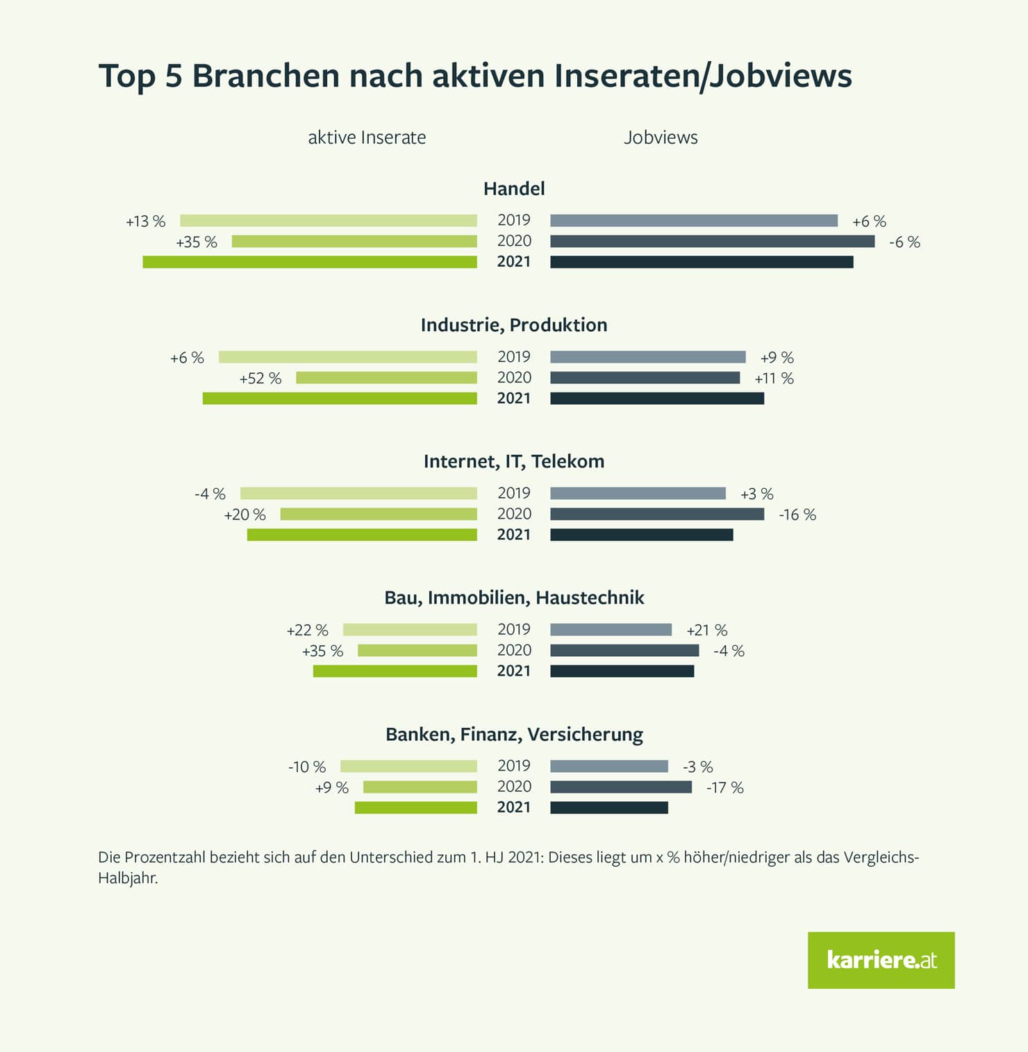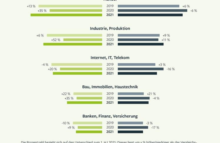 Die Suche nach Personal übertraf im Halbjahr 2021 sogar das Vor-Corona-Niveau: So wurden im Bau um 22 Prozent und im Handel um 13 Prozent mehr Fachkräfte gesucht als im Vergleichszeitraum 2019. Aktuell werden in den Branchen Bau, Immobilien und Haustechnik um 22 Prozent mehr Stelleninserate ausgeschrieben als im Vergleichszeitraum 2019, im Handel wurde ein Anstieg von 13 Prozent zum Vor-Corona-Niveau verzeichnet.