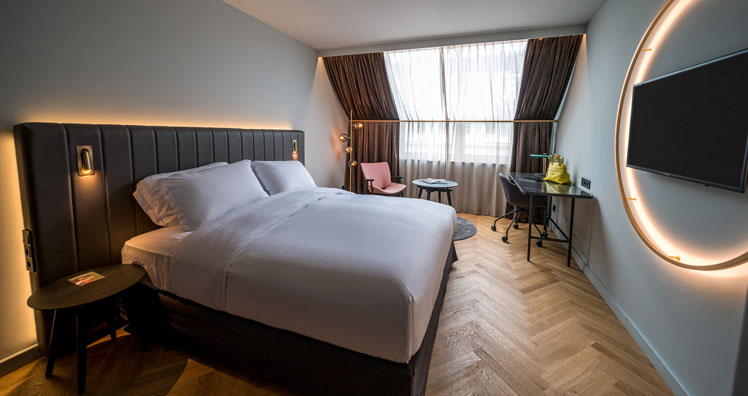 Vom dunklen Backstage-Bereich hinein ins Rampenlicht, direkt auf die Bühne. Nach der Renovierung des Erdgeschoßes inklusive des Restaurants 2018 sind nun auch die Zimmer des Hotels im neuen Design-Konzept zu entdecken. Klassische Elemente wie Tafelparkettboden, Messing, Marmor, Samt und Spiegeldecken wurden mit auffälligen Lichtinstallationen und weiteren Komponenten aus der Welt des Theaters kombiniert.
