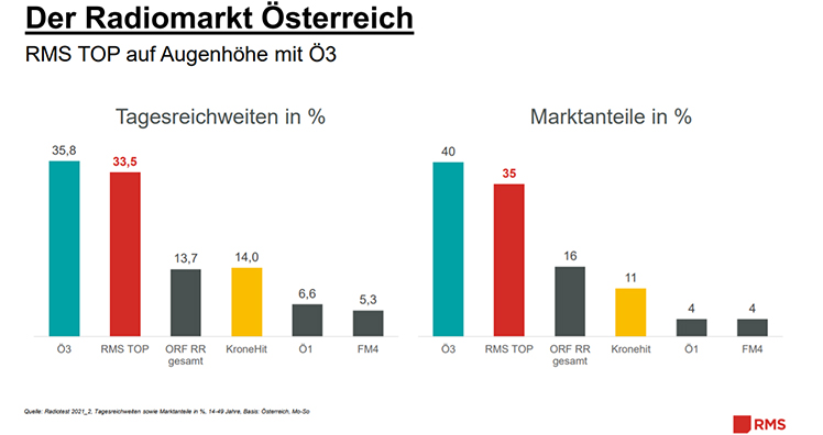 Über zwei Millionen Österreicher:innen (ab zehn Jahren) hören täglich zumindest einen Privatsender aus dem RMS-Verbund. In der Zielgruppe der 14-49-Jährigen werden mit der RMS Top Kombi täglich mehr als ein Drittel der aktiven Kaufentscheider-Zielgruppe erreicht. Damit gehört RMS auch 2021 zu den relevantesten Audio-Angeboten des Landes.